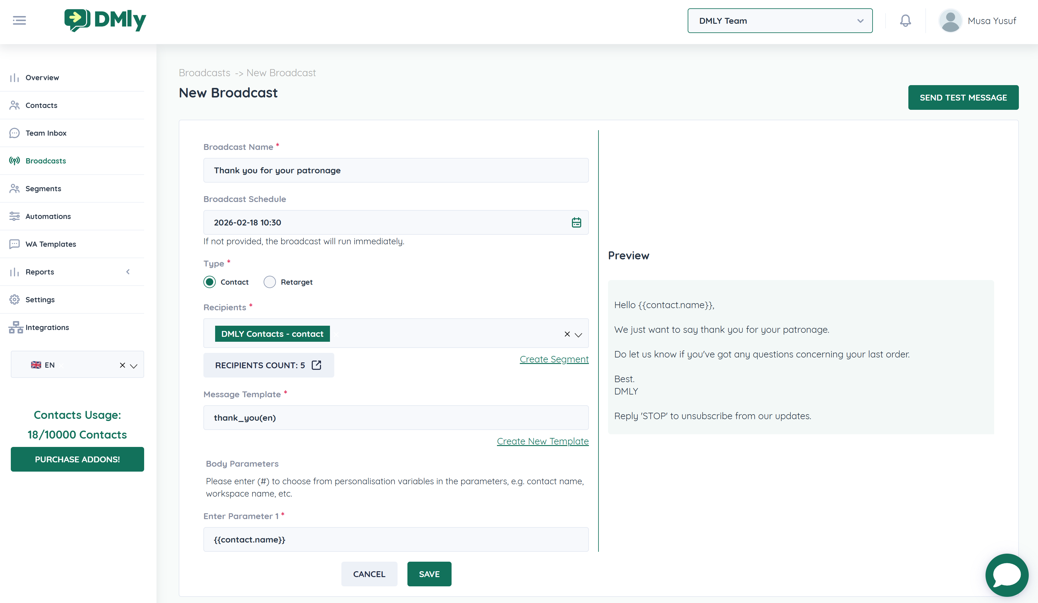 Broadcast campaigns allow you to send bulk messages to selected contacts or segments directly from DMLY. This is ideal for promotions, updates, announcements, follow-ups, and retargeting campaigns.