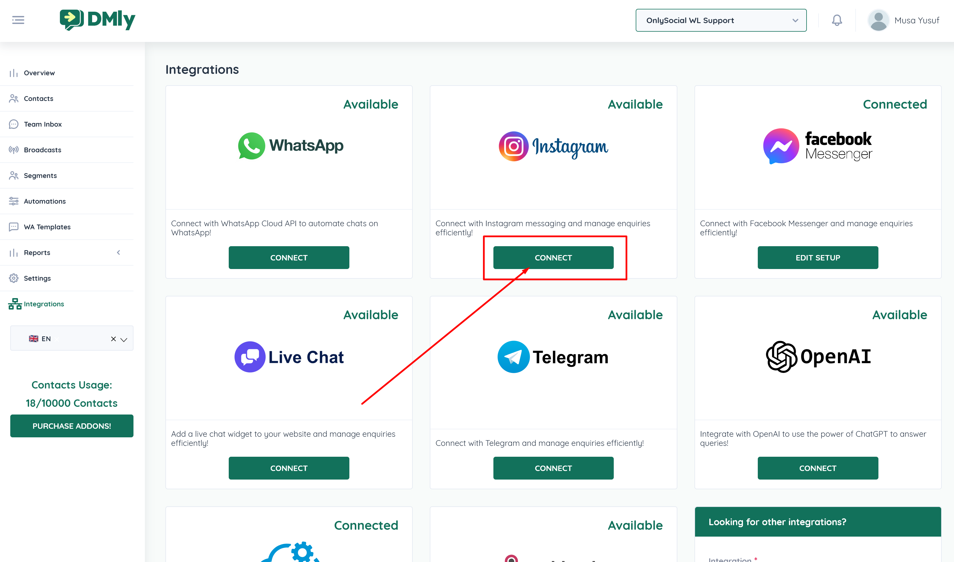 Connect your Instagram Business account to DMLY to manage Instagram Direct Messages inside your unified Team Inbox, alongside WhatsApp, Messenger, Telegram, and Live Chat.