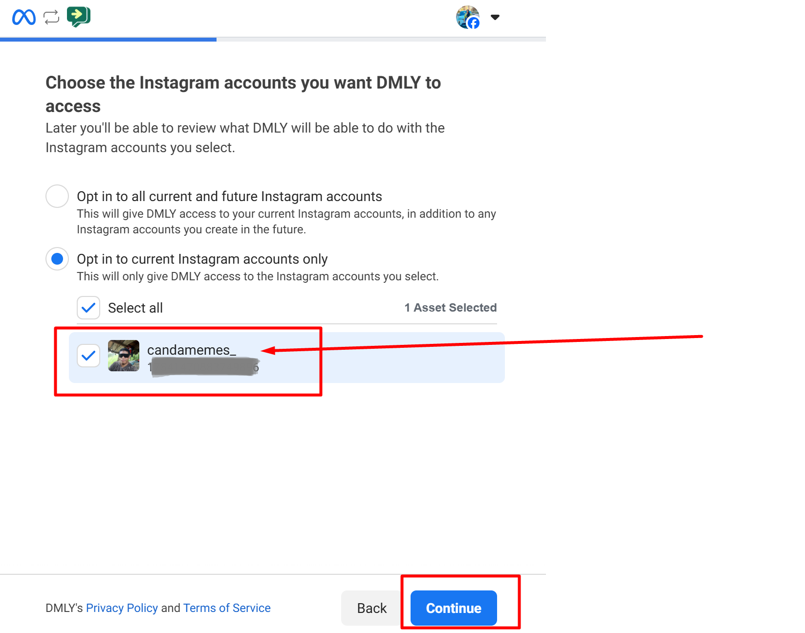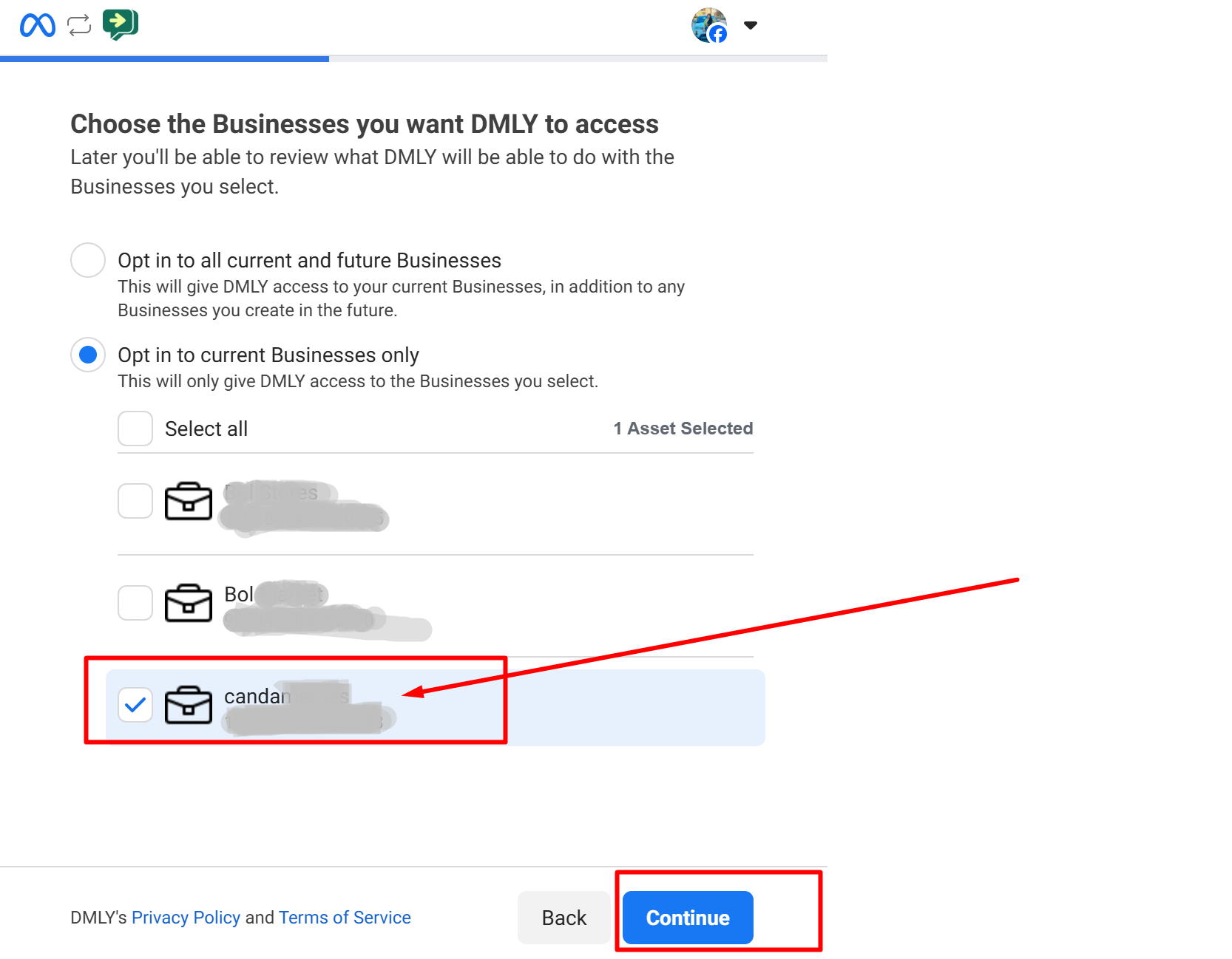Choose the Meta Business Account associated with the selected Facebook Page.