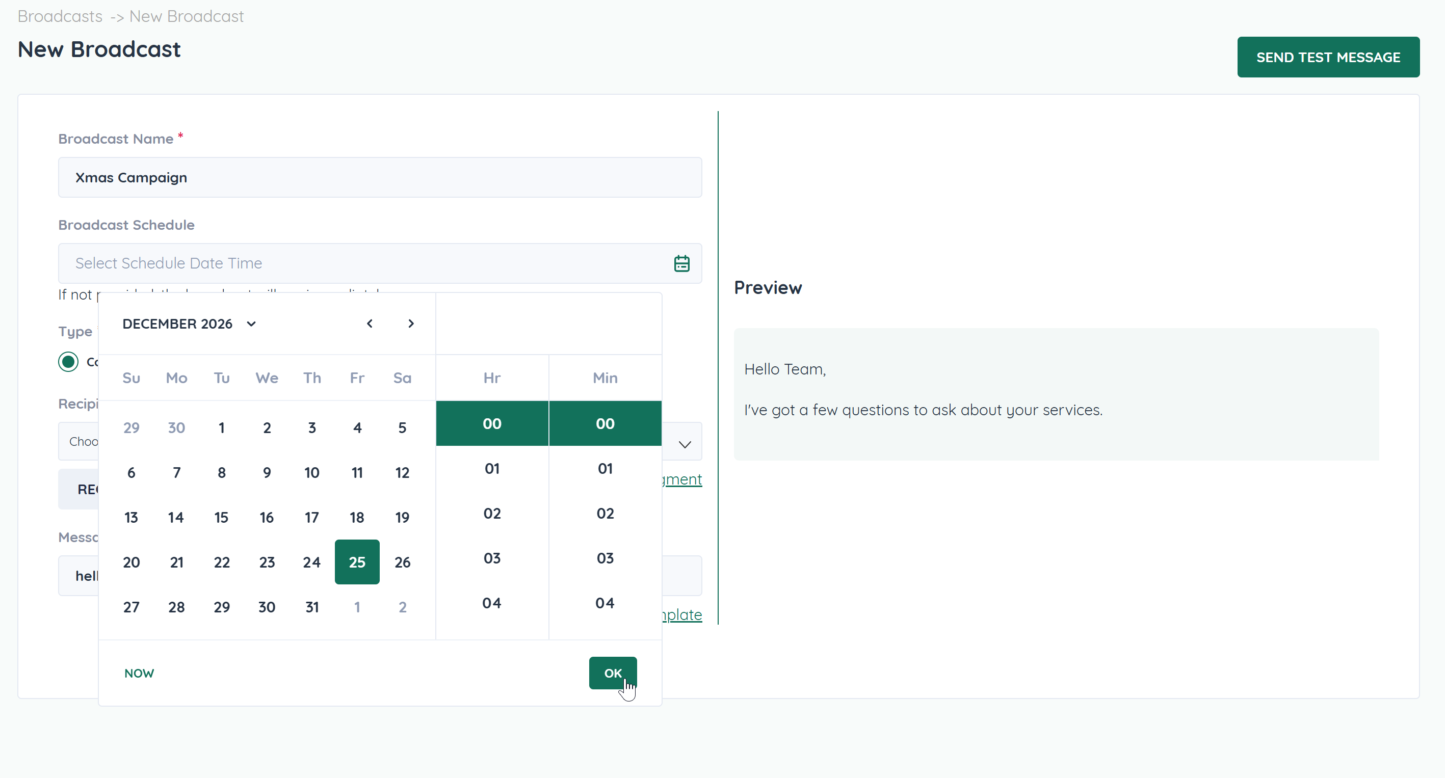 Scheduling allows you to control exactly when your broadcast is sent. Instead of sending immediately, you can choose a future date and time to optimize engagement and maximize results.