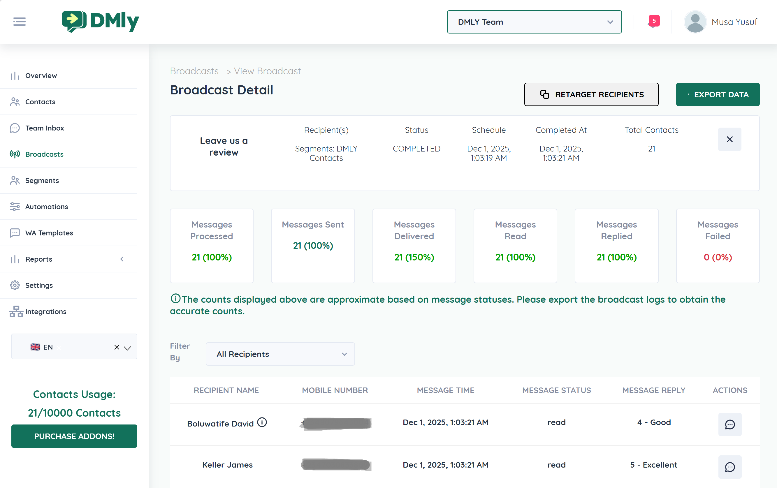 Messages RepliedContacts who responded to the broadcast.
